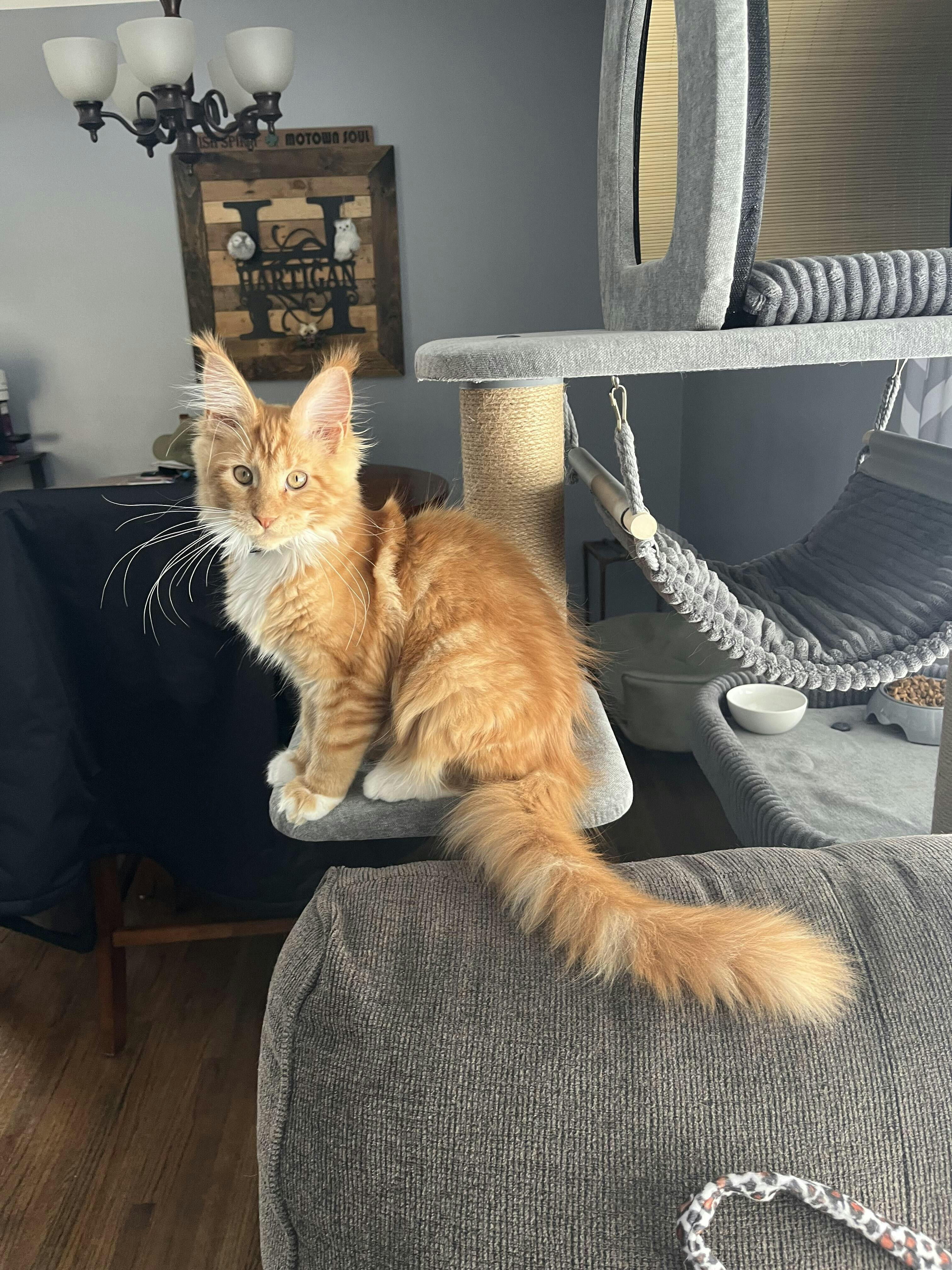 Our feather trainer sits at the end of the line, encouraging kitty to follow. We have two variants of the feather trainer available. Our Black feather trainer is a sleek all black puff accented with guinea feathers, used to increase visibility for your kitty. We also have the black dipped in gold puff, which has gold tipped feather accents.